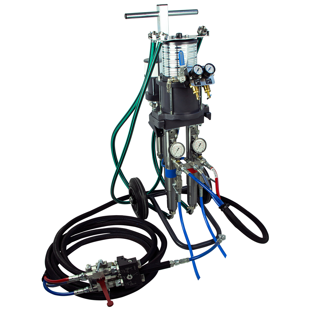 Für die Verarbeitung von 2- oder mehrkomponentigen Produkten (z.B. Acrylat-Gel oder PUR-Gel) sind 2-K-Geräte erforderlich. Durch die extrem kurzen offenen Zeiten, die je nach Produkt und Einstellung variieren können, müssen die Komponenten kurz vor dem Austritt aus dem Injektionsrohr über einen speziellen „Statikmischer“ gemischt werden.