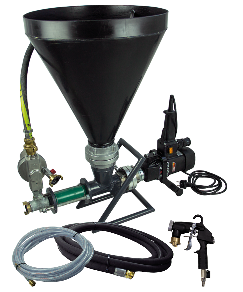 Das Material kann über einen 6- oder 30 ltr-Oberbehälter zugeführt werden.. Mit entsprechendem Zubehör (Spritzlanze, Automatik-Pistole etc)