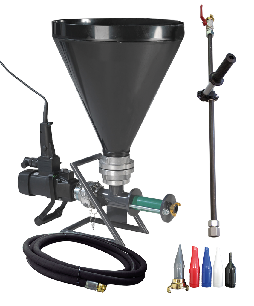 Das Material kann über einen 6- oder 30 ltr-Oberbehälter zugeführt werden. Mit entsprechendem Zubehör (Spritzlanze, Automatik-Pistole etc)