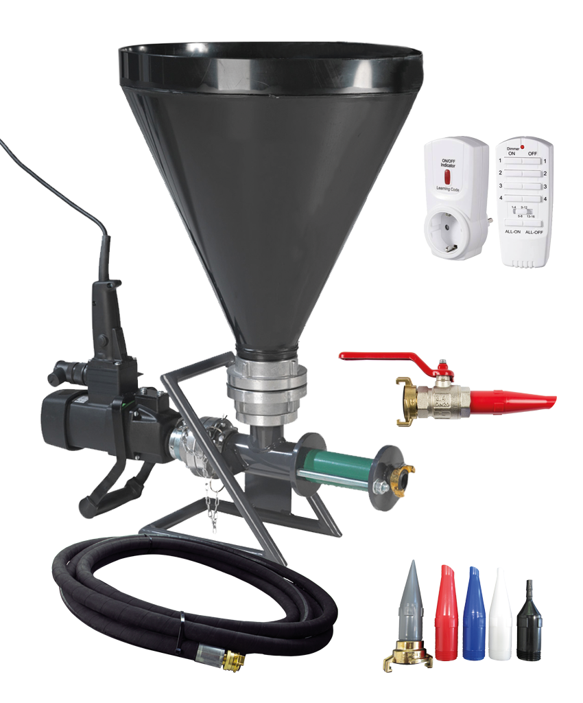 Das Material kann über einen 6- oder 30 ltr-Oberbehälter zugeführt werden.. Mit entsprechendem Zubehör (Spritzlanze, Automatik-Pistole etc)