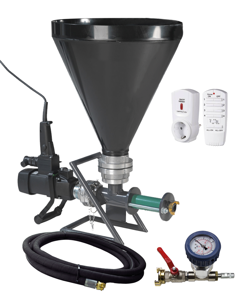 Das Material kann über einen 6- oder 30 ltr-Oberbehälter zugeführt werden.. Mit entsprechendem Zubehör (Spritzlanze, Automatik-Pistole etc)